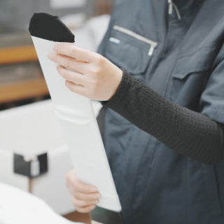 ボーディングとも呼ばれる工程で、生地を型板に入れて、熱と圧力を加え、靴下の大きさを固定します。靴下にアイロンを掛けるような工程です。ここでしっかりと熱を加えることで、お客様のもとに届いても縮まない靴下が完成します。