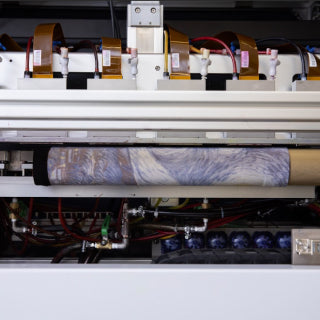 スパイラル式インクジェットプリンターで、円筒状の基材に対してスパイラル状に連続プリントを行います。