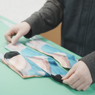 靴下は2つで1足になるという特殊な商品です。包装作業前に、ほこりや糸くずなどがついていないか最終検査し、それを取り除いたうえで、1足ずつ合わせます。また靴下は同じ商品でも数ミリの違いがあり、左右が同じ長さで揃うように、ミリ単位で靴下のペアを作る作業を行います。
